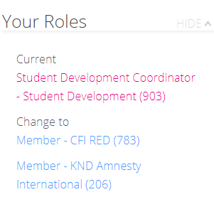 Top Tip: If you are a committee member of more than one society, have more than one volunteer role, or are a student staff member you will potentially have a list of roles. You need to make sure you have clicked on correct role in order to have access to the correct pages.